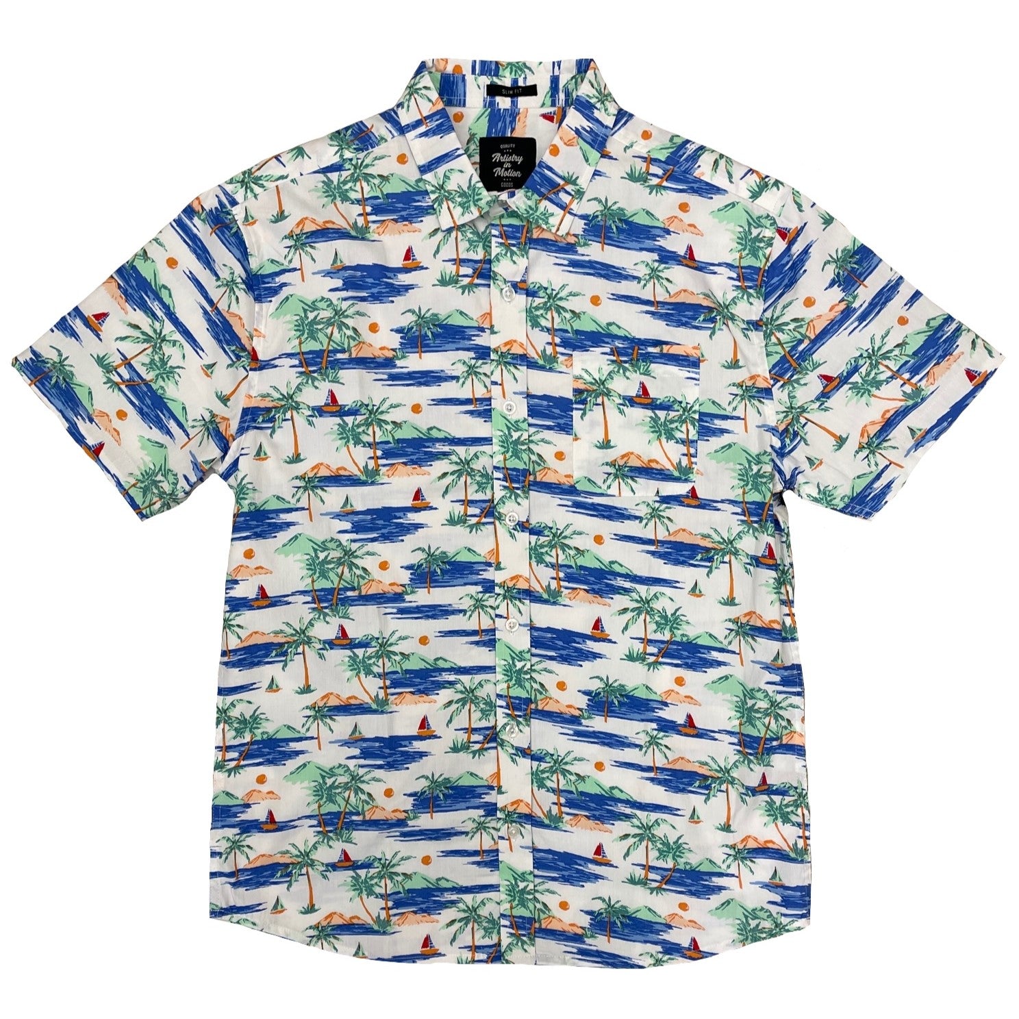 Archipelago printed poplin woven short-sleeve button-down shirt from Artistry In Motion. Lightweight, trim-fit.